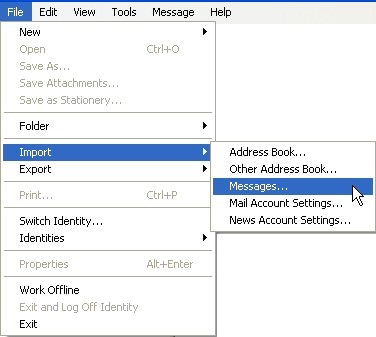 - Install Outlook Express if you don't have it. Go to File > Import. Now select Messages in the top menu. Select "Microsoft Outlook Express 6" from the list and click Next.
