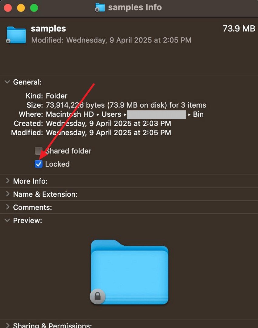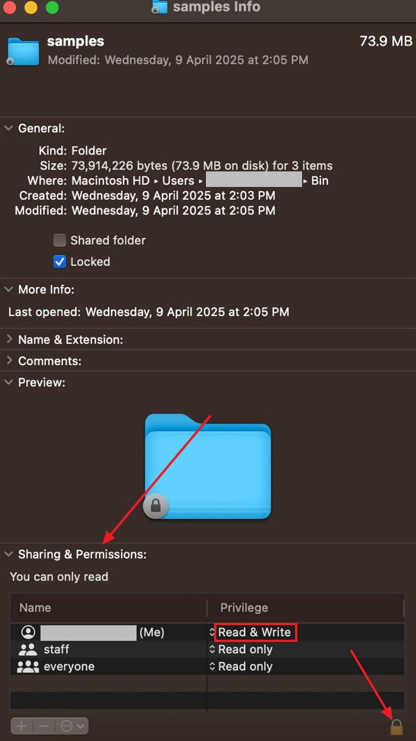 Step 2. Expand the "Sharing & Permissions" section, and check whether you have access to the "Read & Write" section. Click the "Lock"icon in the bottom-right corner to modify the access rights accordingly.