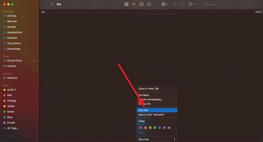 Step 1. Right-click on the specific file or folder and click on the "Get Info" option located within the list after you have accessed the "Bin"folder on your Mac device.