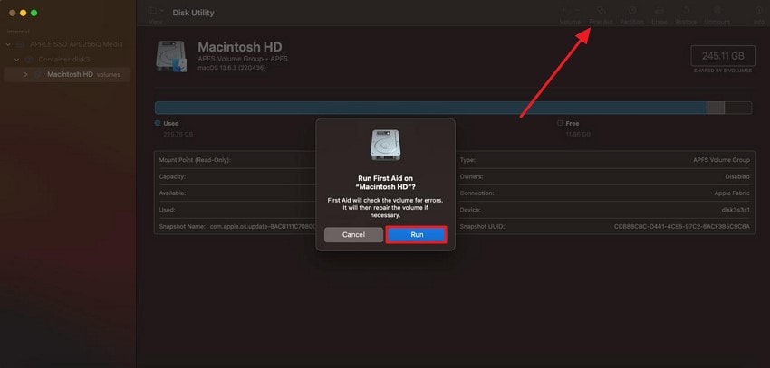 Instructions. Once you have acquired the Disk Utility by clicking on the Launchpad, locate the "First Aid"button in the top-right corner of the interface. The tool will ask for confirmation before running the repair. click on the "Run"button to execute a successful disk repair process.