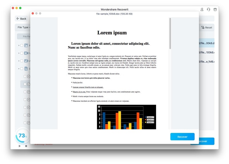 Once the scan is completed, preview the results and find your lost file that Recoverit has retrieved. Finally, hit the “Recover” button to conclude the procedure and save the file back to its original location.