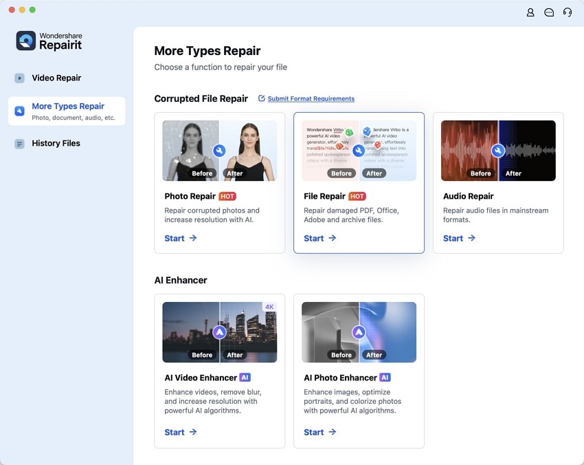 Start the procedure by getting access to Repairit as you download the latest version to your desktop device. From the left sidebar, select the "More Types Repair" section to pick the "File Repair" option.