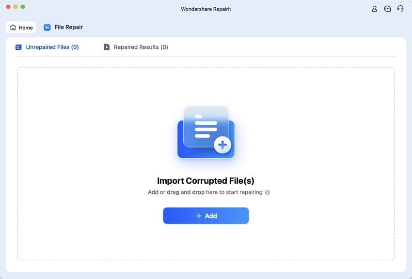 Then, upload your corrupted file to the software by clicking on the “+Add” button in the “Unrepaired Files” section.