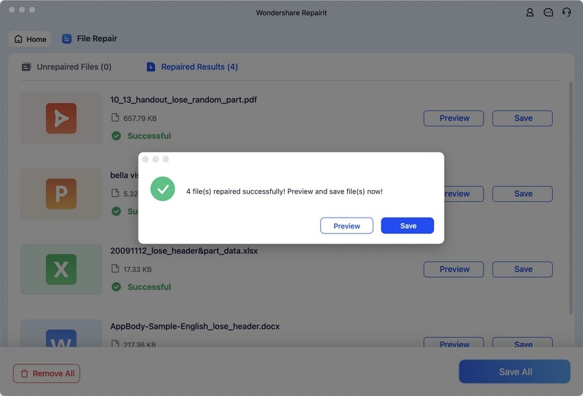 As the files are repaired, they are shifted to the “Repaired Results” section. Here, you can hit the “Preview” option to view all the recovered deleted Numbers files and select “Save” to download them to your device.