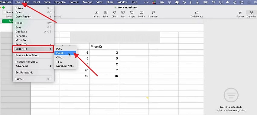 Step 1. Start by getting access to the Numbers file you want to convert. From the top navigation bar, pick the “Export To” option from the drop-down menu of the “File” section. Next, from the extended menu of Export options, choose “Excel” as your format.