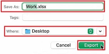Step 3. Upon clicking the Next button, set the “Save As” and “Where” properties of the Excel file and hit “Export” to open a Numbers file as an Excel.