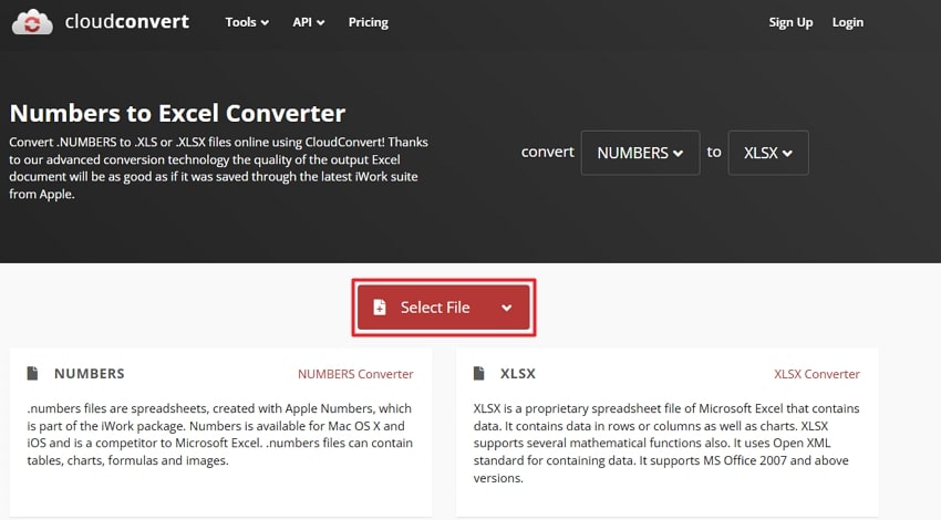 Step 1. Navigate to an online tool like CloudConvert and click on the “Select File” button to upload the Numbers file.