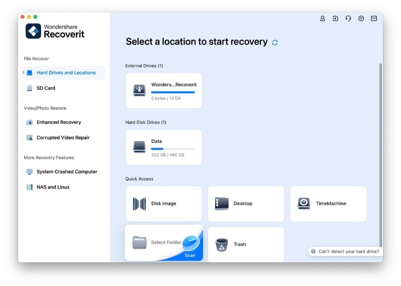 Upon installing Wondershare Recoverit, launch the tool and navigate to the “Hard Drives and Locations” section from the “File Recover” tab on the left side of the screen. Then, choose the location where your file was previously situated to activate the scanning procedure.